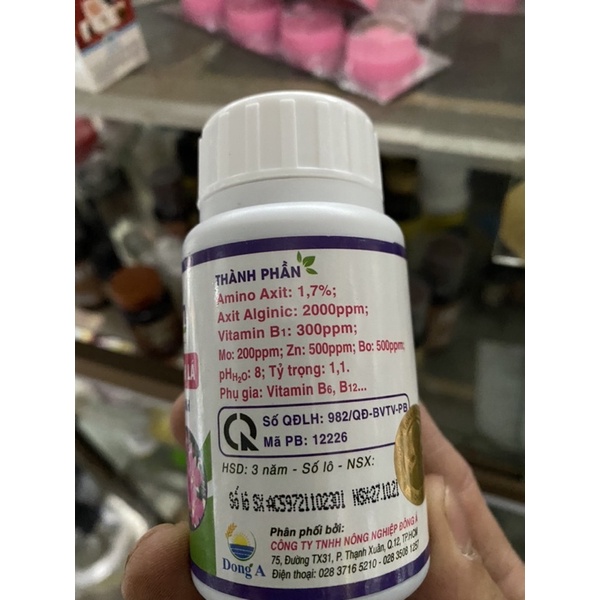 Amino acids 1,7% ; Alginic Acid 2000ppm; Vitamin B1: 300ppm; Mo: 200ppm; Zn: 500ppm; Bo: 500 ppm; pHh2O: 8; Phụ gia Vitamin B6; B12
