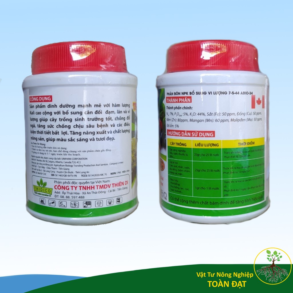 Nts: 7%; P2O5hh: 5%; K2O: 44%; Sắt (Fe): 50ppm; Đồng (Cu): 50ppm; Kẽm (Zn): 80ppm; Mangan (Mn): 60ppm; Molipden (Mo): 50ppm; Độ ẩm: 5%.