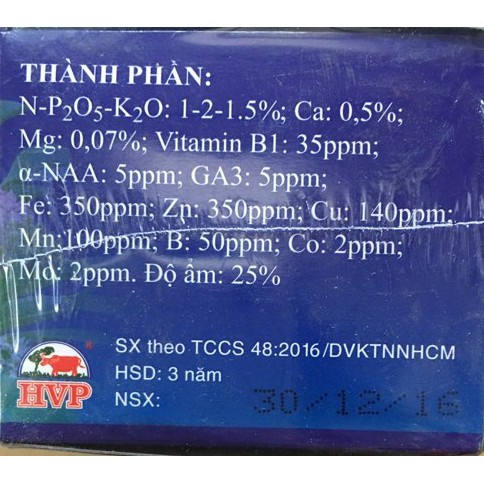 Thành phần: NPK: `1-2-1.5%, Ca: 0.5%, Mg: 0.07%, Zn: 350ppm, Vitamin B1: 35ppm, NAA: 5ppm, GA3: 5ppm, Fe: 350ppm, Cu: 140ppm, Mn: 100ppm, B: 50ppm, Co: 2ppm, Mo:2ppm, Ẩm độ: 25%