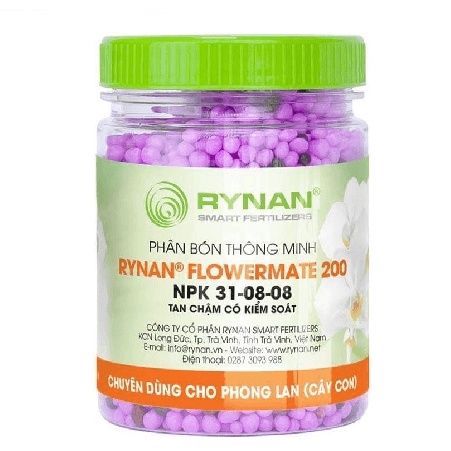 Phân bón thông minh RYNAN 200RYNAN® FLOWERMATE 200 là dòng sản phẩm phân bón thông minh tan chậm có kiểm soát chuyên dùng cho hoa phong lan. Cung cấp đầy đủ dưỡng chất cần thiết ở giai đoạn cây con, thời gian cung cấp dưỡng chất lên đến 120 ngày. Giúp cây sinh trưởng khỏe mạnh, tăng sức đề kháng, hạn chế nấm bệnh, kích thích mọc mầm, phát triển thân lá.