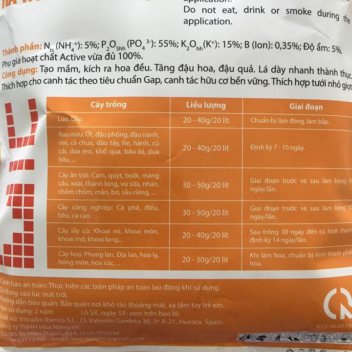 Thành phần: Nts: 5%; P2O5hh: 55%; K2Ohh: 15%; B: 0,35%