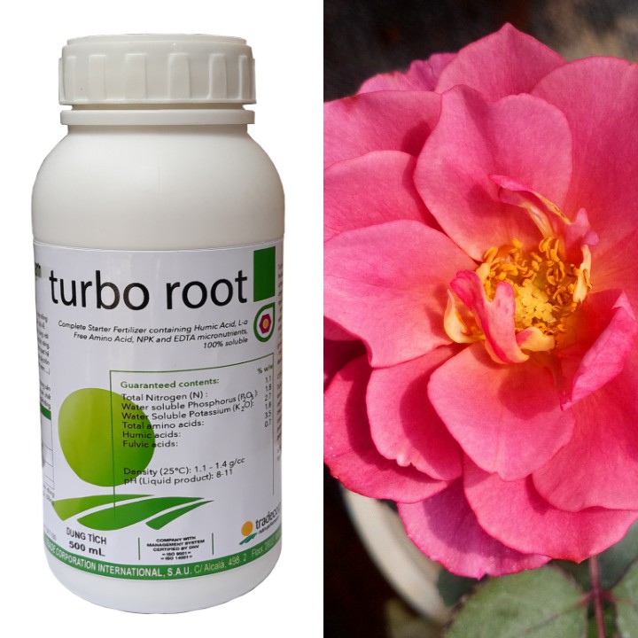 Phân bón ra rễ Turbo Root được dùng làm phân bón kích thích ra rễ cho cây hoa hồng bởi vì nó chứa các thành phần hữu cơ humic axit, fulvic axit giúp cây trồng phát triển lông tơ bộ rễ, phát triển hình thành rễ mới tăng khả năng hấp thụ các chất dinh dưỡng có sẵn trong đất. Đồng thời bổ sung hàm lượng hữu có trong đất, cải tạo hệ vi sinh vật có lợi.
