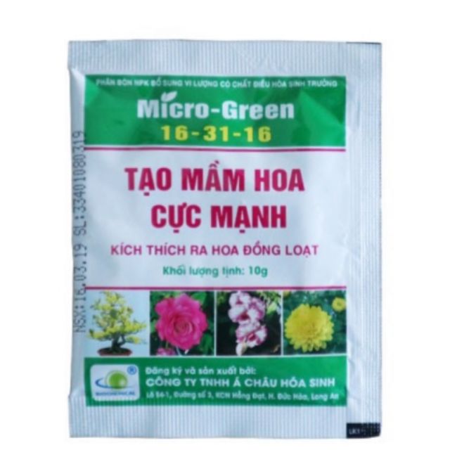 Phân bón npk bổ sung vi lượng có chất điều hòa sinh trưởng Micro-Green 16-31-16. Tạo mầm hoa cực mạnh, kíc thích ra hoa đồng loạt, có tác dụng làm xanh cây, tốt rễ ,tốt lá, mập mầm, vươn chồi, phục hồi cây sau khi ra hoa, tạo mầm hoa cực mạnh, bật nhiều nụ, trổ nhiều bông, thúc đẩy ra hoa đồng loạt , đều bông.KLT: 10g.