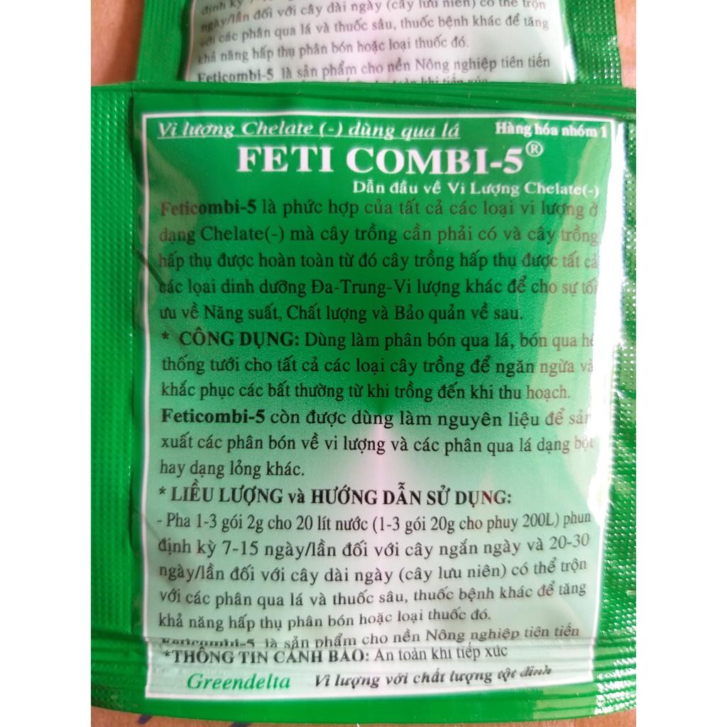 Phân Bón Siêu Vi Lượng Chalate(-) FETICOMBI 5 (2gr)Phân bón vi lượng qua lá FETICOMBI5 nhằm bổ sung các chất vi lượng giúp cây trồng khỏe mạnh tăng sức đề kháng và phát triển tốt.