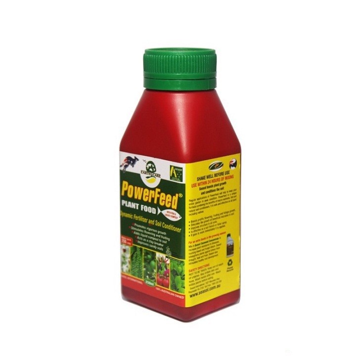 Phân đạm cá cao cấp Powerfeed 14-1.4-9 nhập khẩu Australia 250mlPOWERFEED CONCENTRATE (14-1.4-9) PHÂN BÓN LÁ NPK DẠNG NƯỚC SẢN XUẤT TỪ NƯỚC ÚC - POWERFEED SEASOLTHÀNH PHẦN: Nitrogen (N) 14 %, Phosphorus (P) 1.4% , Potassium (K) 9.0%, Boron (B) 1.6 mg/L, Ca 460 mg/L., Cacbon12.5%, đạm cá hồi cao cấp, acid amin, vitamin, selenium và các chất kích thích sinh trưởng tự nhiên.Powerfeed được chiết suất từ cá nên có đầy đủ các nguyên tố vi lượng acid amin, Vitamin, Canxi, Lân và các kích thích tăng trưởng tự nhiên.Là phân bón chất lượng cao và có khả năng cải tạo đất có chứa các nguyên tố vi lượng, cá và chất mùn.Gia tăng màu sắc cho hoa, quả và lá.Gia tăng số lượng hoa xanh dày lá và số lượng chồi và tăng đậu quả.Gia tăng các dưỡng chất hữu ích và tăng cường sự hấp thụ cho cây trồngTăng cường chất dinh dưỡng cho cây, trong giai đoạn kích trái và tăng trọng lượng tráiAn toàn và hiệu quả với tất cả các loại cây trồng bao gồm hoa, cây ăn trái, cây công nghiệp, rau, vườn ươm, cây cảnh.Powerfeed được chứng nhận là phân bón NPK đạt tiêu chuẩn của Australia và tại Việt Nam được Chứng nhận hợp qui bởi Trung tâm khảo nghiệm phân bón vùng Nam bộ thuộc Bộ Nông nghiệp và Phát triển nông thôn.An toàn môi trường, không ảnh hưởng đến con người, cách ly rau quả 5 ngày.CÔNG DỤNG:Mát cây, xanh lá, đẻ nhiều nhánh, đâm nhiều tược, ra nhiều hoa, trổ bông đồng lạt, đậu nhiều trái, to quả to củ, tăng diệp lục tố, màu sắc hoa tươi đẹp, tăng kháng phèn, kháng mặn, phụ hồi gốc suy, trẻ hoa cây lâu năm,..