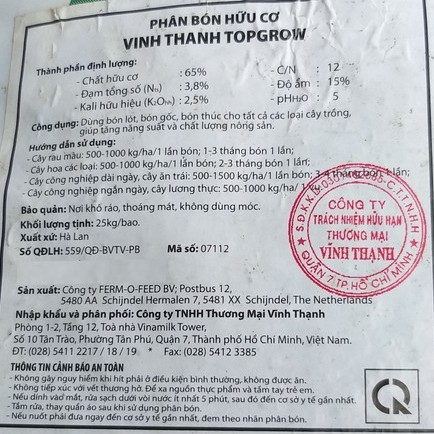 Thành phần: Hữu Cơ 65%; N 3%; K2O hh 2,5% và các trung vi lượng khác.