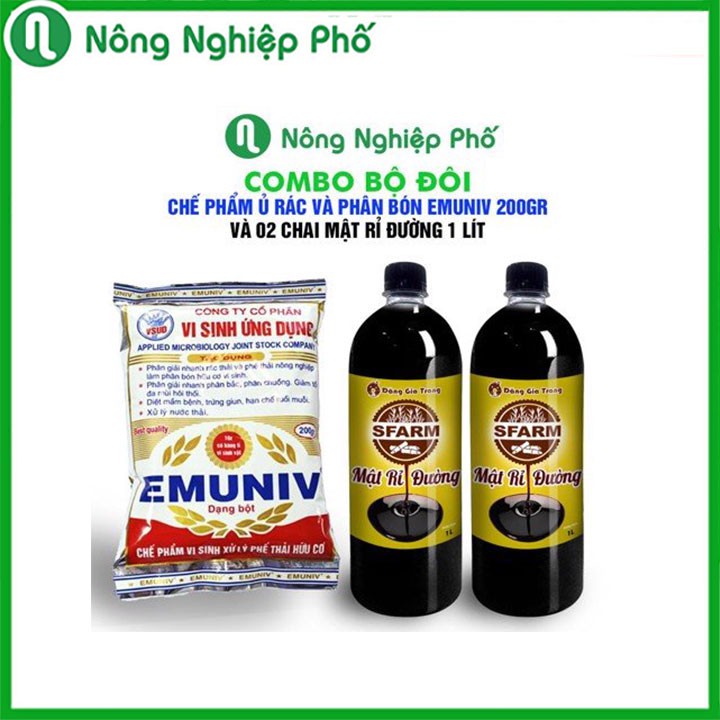 Combo bộ đôi chế phẩm vi sinh emuniv và Mật rỉ đường là sự kết hợp hoàn hảo sản phẩm dùng để đẩy nhanh quá trình ủ phân. Chế phẩm emuniv được sản xuất với chủng vi nấm chính là: Lactobacillus spp. và Bacillus spp. Streptomyces spp. và Saccharomyces cereviseae đẩy nhanh quá trình phân giải các hợp chất khó phân giải bằng hệ enzyme của chúng. Từ đó, làm đống ủ được nhanh được phân giải, rút ngắn thời gian và tăng chất lượng phân ủ. Bên cạnh đó, Mật rỉ đường là nguồn cung cấp các hợp chất đường và là nguồn thức ăn chính cho vi nấm có lợi, giúp chúng tăng nhanh về mặt sinh khối, mật độ vi sinh vật từ đó đẩy nhanh tiến độ phân giải phân bón và các chất khó phân giải.