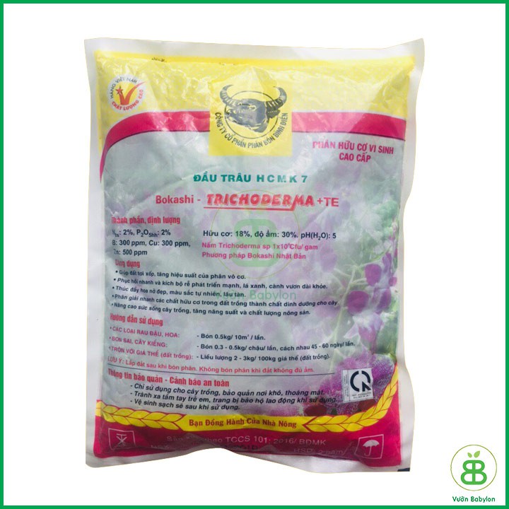 Phân bón hữu cơ vi sinh Đầu Trâu HCMK 7 Bokashi TrichodermaPhân bón hữu cơ vi sinh Đầu Trâu HCMK 7 Bokashi Trichoderma được sản xuất bởi công ty cổ phân Bình Điện với công nghệ tiên tiến. Phân dược sản xuất bằng các loại rác thải hữu cơ được bổ siung các vi sinh vật có lợi, đặc biệt là Nấm đối kháng Trichoderma. Ngoài ra phân còn được bổ sung các chất vi lượng cần thiết cho cây trồng.\
