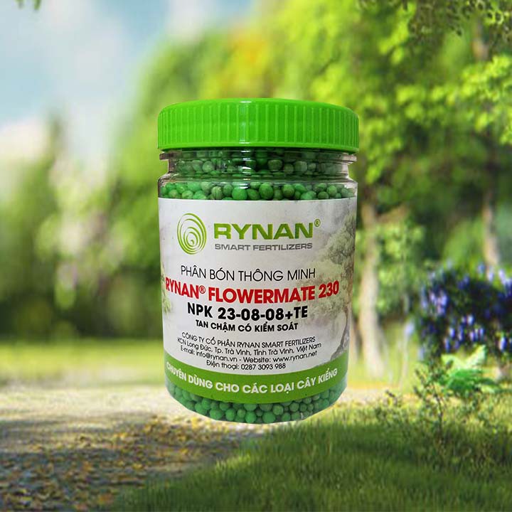 RYNAN® FLOWERMATE 230 là dòng sản phẩm phân bón thông minh tan chậm có kiểm soát chuyên dùng cho các loại kiểng lá, kiểng treo, bonsai, kiểng công trình,... Thời gian cung cấp dưỡng chất lên đến 180 ngày. Giúp cây sinh trưởng khỏe mạnh, tăng sức đề kháng, hạn chế nấm bệnh, phát triển thân lá, giữ màu xanh cho cây.