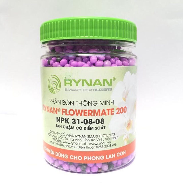 Phân tan chậm thông minh Rynan Flowermate 200 NPK 31-08-08 chuyên dùng cho phong lan cây con hũ 150gQuy cách đóng gói: Hũ 150g
