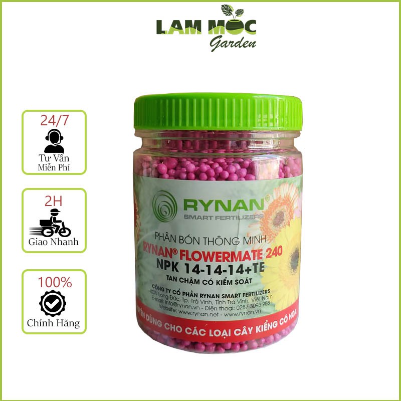 Phân Tan Chậm RYNAN FLOWERMATE 240 NPK 14-14-14+TE là dòng phân bón thông minh tan chậm có kiểm soát chuyên dùng cho cây kiểng trong nhà và ngoài vườn, thời gian gian cung cấp dưỡng chất lên đến 90 ngày. Giúp cây sinh trưởng khỏe mạnh, tăng sức đề kháng, hạn chế nấm bệnh, phát triển thân lá, giữ màu xanh cho câyXuất Xứ: