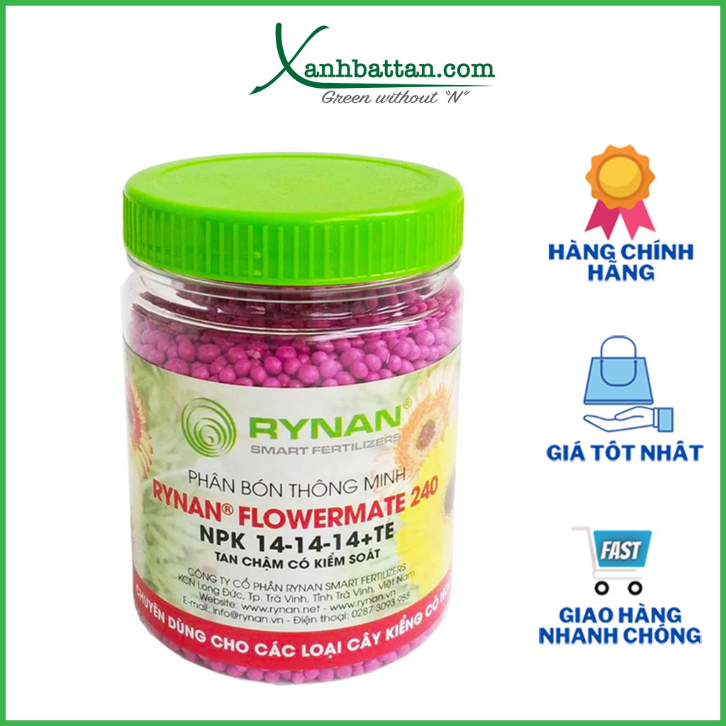 Phân Bón Thông Minh Dạng Tan Chậm Rynan Flowermate 240Phân Bón Thông Minh Rynan® 240 là dòng phân bón vô cơ được sản xuất theo công nghệ tiên tiến, với lớp màng polymer bao bọc bên ngoài giúp việc kiểm soát và điều tiết phóng thích dinh dưỡng một các hiệu quả. Phân bón thông minh Rynan® 240 được sản xuất với hàm lượng khoáng N-P-K cân bằng với 14% và hàm lượng TE (Zn và Bo 100ppm) giúp nuôi hoa và dưỡng hoa lâu tàn, giúp cánh hoa bền màu và mùi thơm tự nhiên hơn.