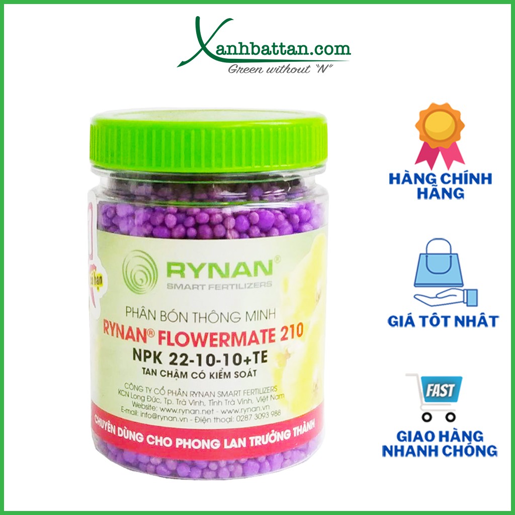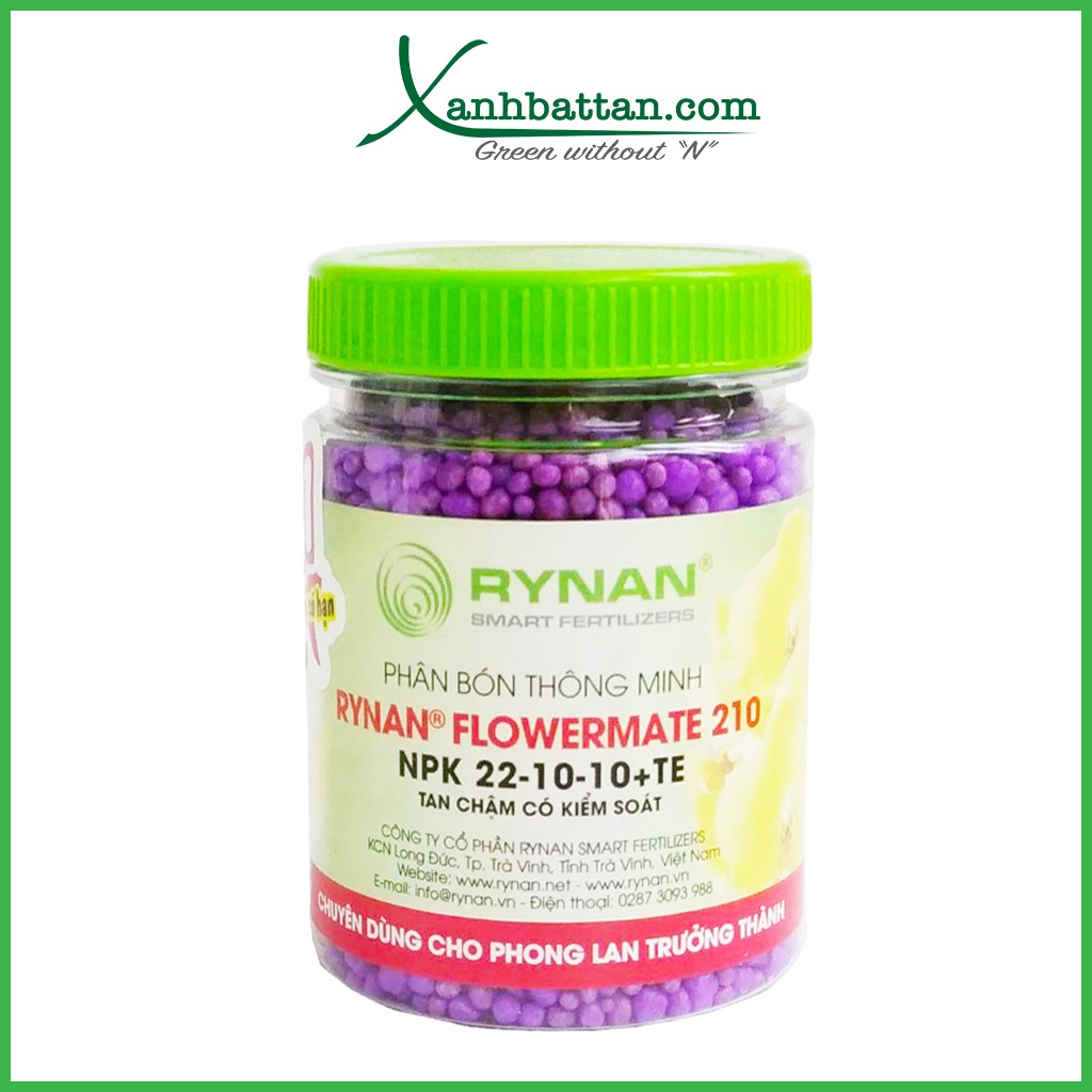 Phân Bón Thông Minh Dạng Tan Chậm Rynan Flowermate 210Phân Bón Rynan Flowermate 210 là dòng phân bón thông minh, sản phẩm được sản xuất theo công nghệ tiên tiến với lớp màng polymer bao bọc bên ngoài có khả năng kiểm soát và điều tiết việc giải phóng dinh dưỡng một cách hiệu quả. Phân bón Rynan 210 chứa hàm lượng khoáng NPK lần lượt là 21%, 10%, 10% được dùng cho lan trong giai đoạn trưởng thành và giai đoạn phục hồi cây trồng sau ra hoa. Bên cạnh đó, sản phẩm Rynan 210 còn bổ sung thêm chitosan và hàm lượng trung vi lượng giúp cây tăng khả năng chống chịu sâu bệnh hại, kháng nấm hiệu quả.