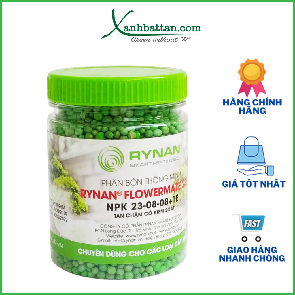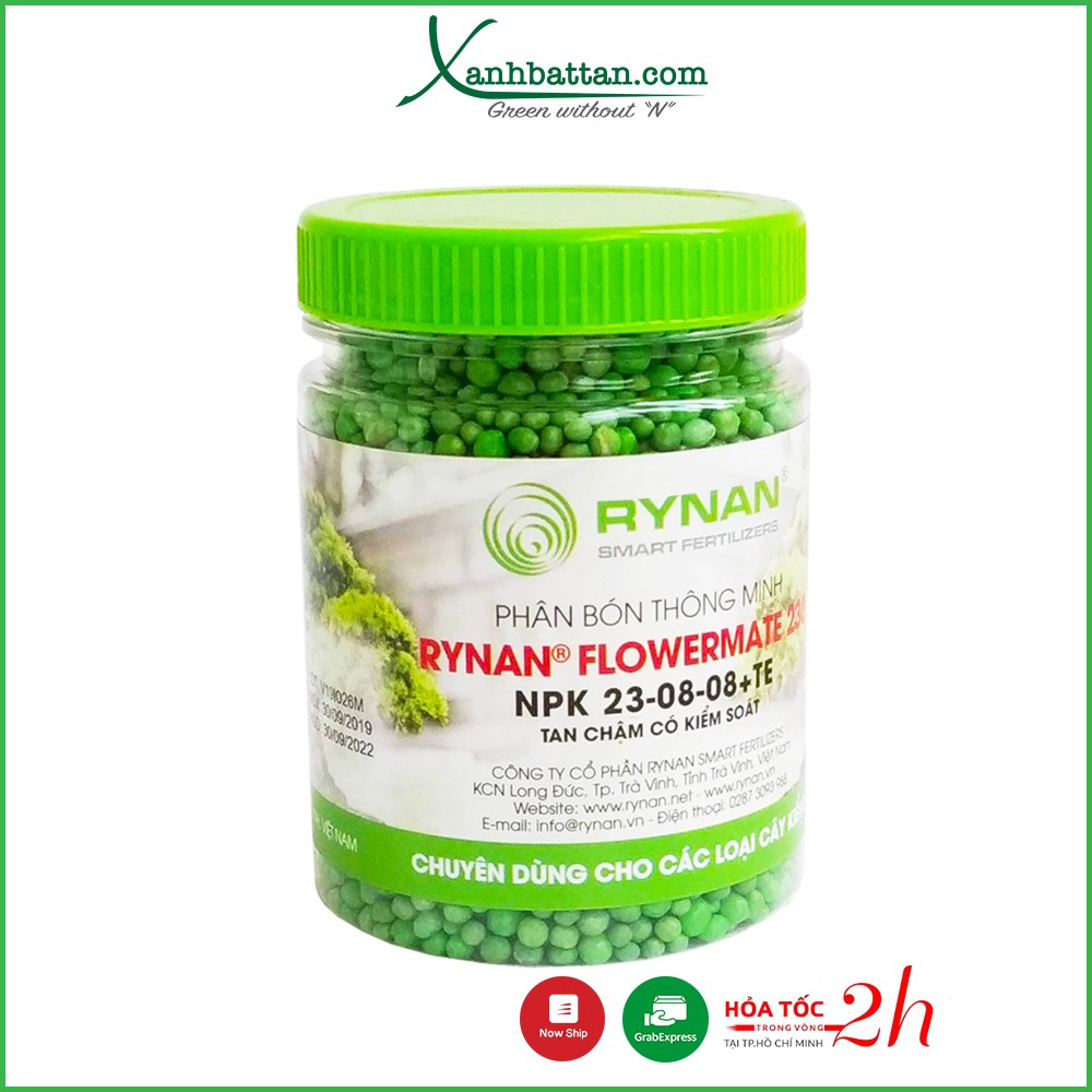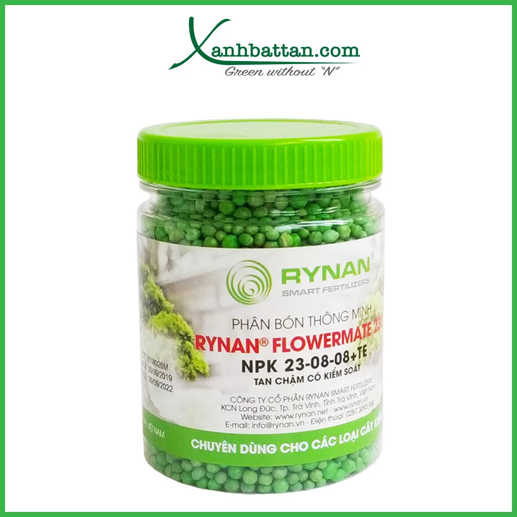 Phân Bón Thông Minh Dạng Tan Chậm Rynan Flowermate 230Phân Bón Thông Minh Rynan 230 là dòng sản phẩm phân bón vô cơ được sản xuất theo công nghệ tiên tiến với lớp màng bao bọc polymer giúp kiểm soát và điều tiết việc phóng thích dinh dưỡng một các thông minh và hiệu quả. Dòng sản phẩm phân bón Rynan 230 chứa hàm lượng khoáng N-P-K lần lượt là 23%, 8% và 8% giúp kích chồi, kích lá, giúp chồi và lá sinh trưởng mạnh và xanh mượt. Phân bón thông minh Rynan 230 được dùng trong giai đoạn kích chồi, kích lá - Dùng chuyên dụng cho các loại hoa kiểng lá.