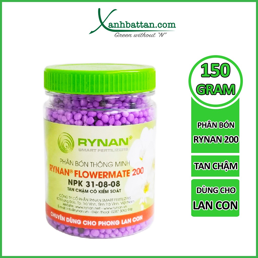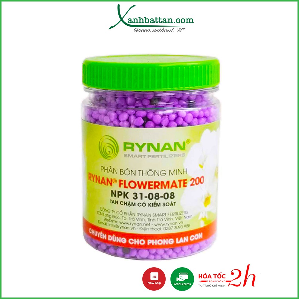 Phân Tan Chậm Rynan Flowermate 200Phân Bón Rynan 200 là dòng phân bón vô cơ, dòng sản phẩm được sản xuất theo công nghệ tiến tiến với lớp màng polymer bao bọc giúp kiểm soát việc giải phóng dinh dưỡng hiệu quả và theo nhu cầu của cây trồng. Phân bón Rynan Flowermate 200 có hàm lượng khoáng N-P-K lần lượng là 31%, 8% và 8% và hàm lượng chitosan được bổ sung giúp cho phong lan sinh trưởng mạnh, giúp cây con sinh trưởng và phát triển, chồi và lá sinh trưởng mạnh.
