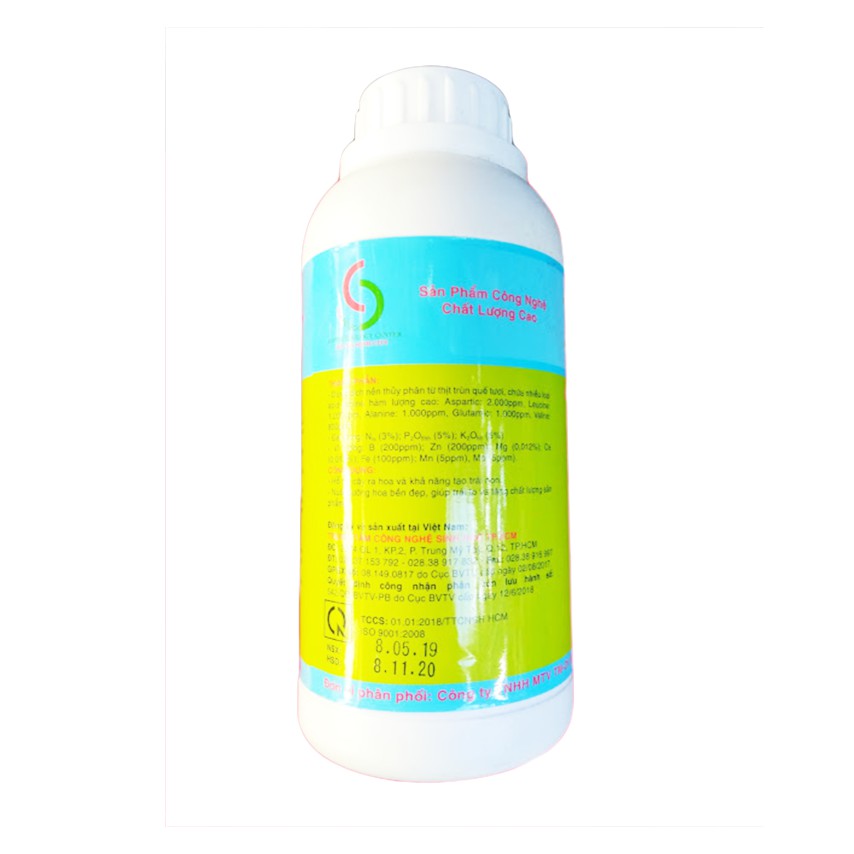 Vi lượng: B – 200 ppm; Zn – 200 ppm; Mg – 120 ppm; Ca – 120 ppm; Fe – 100 ppm