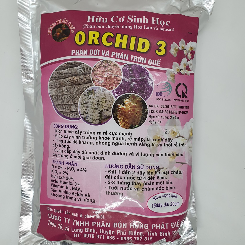 Phân túi lưới hữu cơ sinh học Orchid 3 Phân dơi và phân trùn quế - 1 gói 15 dây 20cmThành phần N: 2% P: 4% K: 2% Acid huimic 3% Hữu cơ 20% NAA, acid amin, B1 và trung vi lượng