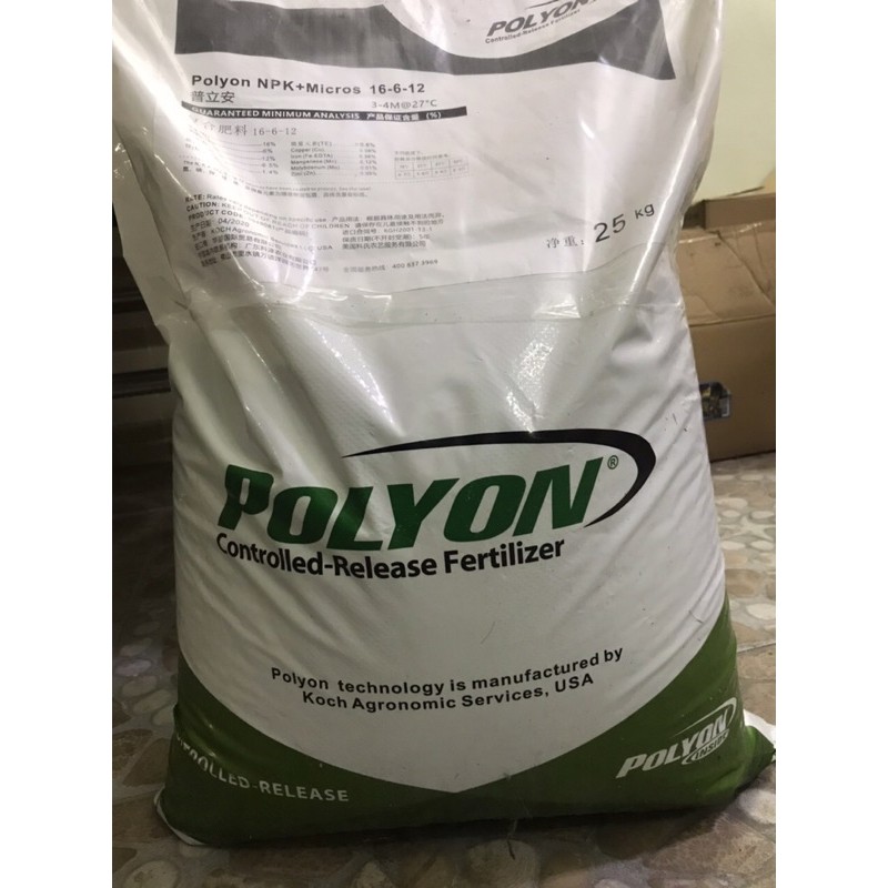 **Phân xanh Polyon Mỹ, phân xanh Mỹ 16-6-12 đều là loại phân bón tan chậm có kiểm soát có xuất xứ từ Mỹ được biết đến rộng rãi trong ngành trồng trọt như một giải pháp ổn định, đã được chứng thực đem lại hiệu quả cho người trồng. Phân xanh Polyon Mỹ, phân xanh Mỹ 16-6-12 được sản xuất bằng cách bọc hợp chất phân bón hỗn hợp đồng nhất NPK với một lớp vỏ đặc biệt. Thời gian giải phóng chất dinh dưỡng được kiểm soát bởi lớp vỏ này và cùng với một “tác nhân hóa học giải phóng đặc biệt” ở trong lớp vỏ. Chính tác nhân này tạo nên sản phẩm phân bón tan chậm có kiểm soát đồng đều và ổn định nhất trên thế giới. Cấu tạo của lớp vỏ của Polyon, và tác nhân giải phóng, tạo nên những đường dẫn ở cấp phân tử giống như ma trận trong lớp vỏ bọc. Khi Polyon được cho vào đất, nước trong đất thấm vào hạt phân thông qua những đường dẫn này và hòa tan dưỡng chất bên trong. Dung dịch dinh dưỡng này sau đó sẽ được giải phóng dần đều qua những đường dẫn đó. Những phân bón tan chậm khác phụ thuộc vào độ dày của lớp vỏ bọc để kiểm soát tốc độ phân giải. Điều này làm cho các hạt phân có kích cỡ khác nhau và làm phụ thuộc vào tính chất vật lý của phân để có thể giải phóng đều chất dinh dưỡng. Do đó thời gian giải phóng sẽ bị hạn chế và cũng gián tiếp làm tăng trọng lượng và chi phí của sản phẩm. Đối với Polyon, chỉ cần thay đổi lượng tác nhân giải phóng đặc biệt trong lớp vỏ bọc là có thể có thời gian giải phóng phù hợp với yêu cầu.