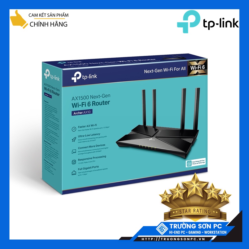 Công nghệ Wi-Fi 6—Archer AX10 được trang bị công nghệ Wi-Fi mới nhất, Wi-Fi 6, cho tốc độ nhanh hơn, dung lượng cao hơn và giảm thiểu tắc nghẽn mạng.