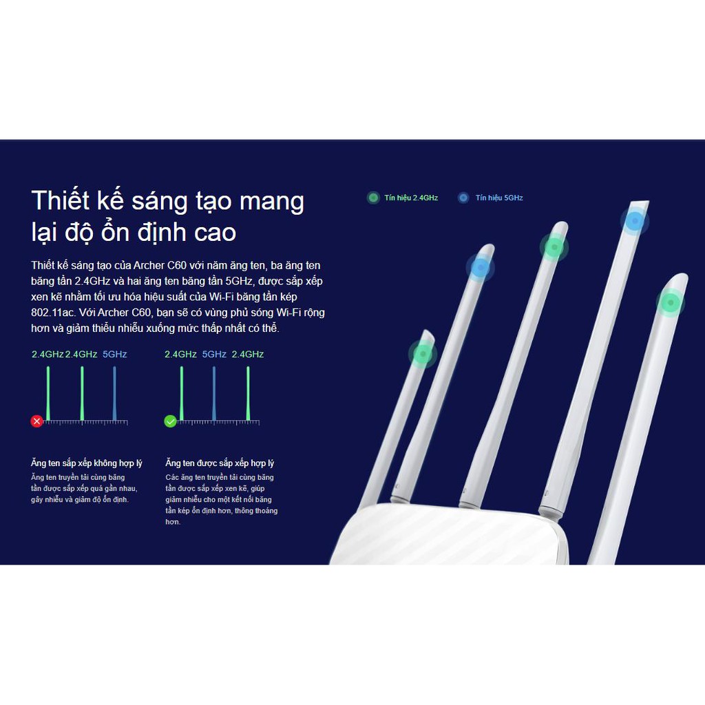 Bộ Phát Sóng Wi-Fi Tp-Link Archer C60 AC1350 2 Băng Tần 2.4GHz (450Mbps) và 5GHz (867Mbps) - Chính Hãng - Bảo Hành 24Th.