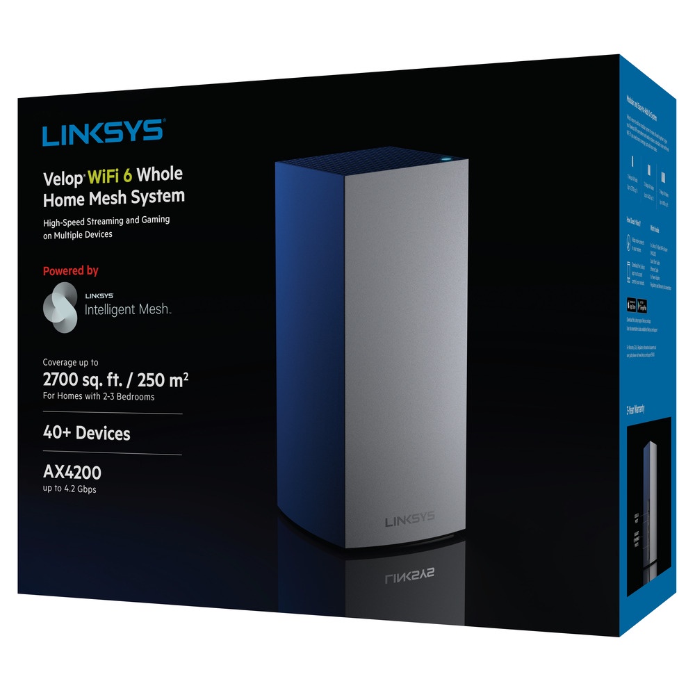 📌 Linksys Velop AX4200 được trang bị bộ vi xử lý lõi tứ 1.4 GHz, RAM 512 MB và bộ nhớ flash 512 MB. Đó là hệ thống WiFi 6 – 3 băng tần tổng tốc độ 4200Mbps (2.4GHz 600Mbps + 5GHz 1200Mbps + 5GHz 2400Mbps). Bạn có thể mua Linksys Velop Entire House Clever Mesh WiFi 6 (AX4200) theo gói một, hai hoặc ba, tùy thuộc vào yêu cầu của bạn