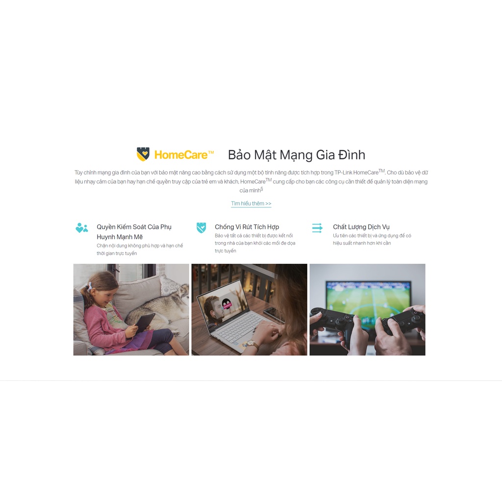 - Bảo Mật Toàn Diện: Mã hóa WPA3 và TP-Link HomeCareTM cung cấp các tính năng được cá nhân hóa, bao gồm - Quyền kiểm soát của phụ huynh, Chống vi-rút và Chất lượng Dịch vụ (QoS) để đảm bảo trải nghiệm trực tuyến an toàn hơn.