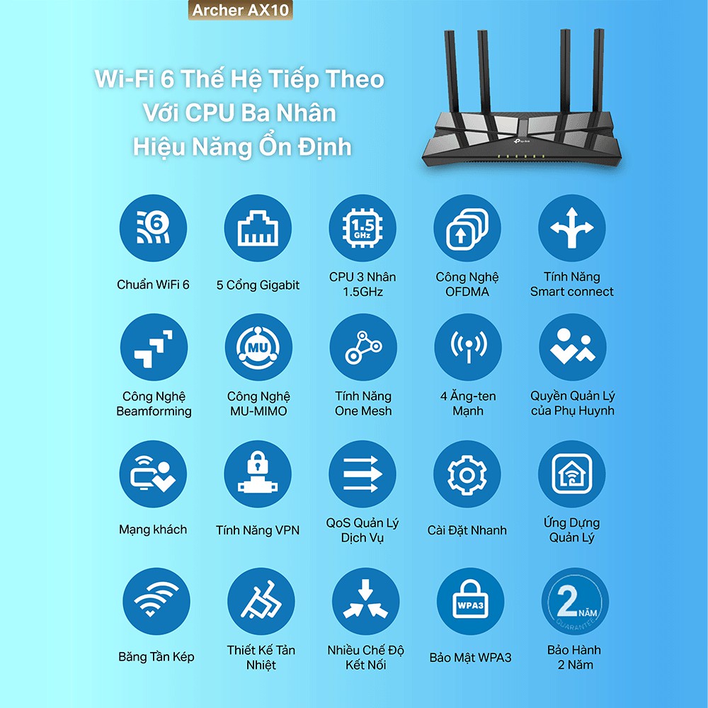 Bộ phát wifi router TP-Link Archer AX10 wifi 6 chuẩn AX 1500Mpbs,Wifi thế hệ mớiTÍNH NĂNG NỔI BẬT: Bộ phát wifi router TP-Link Archer AX10 wifi 6