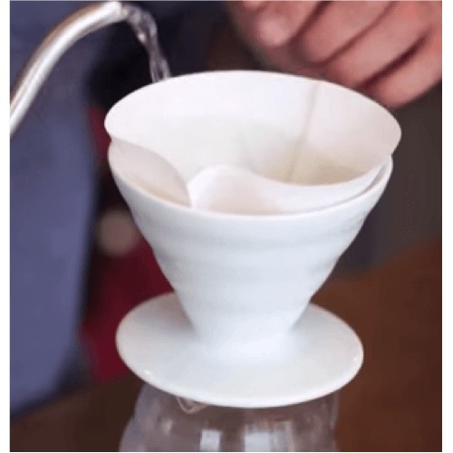 + Bước 1: Gấp giấy lọc theo đường nếp gấp và đặt vào phễu lọc hình chóp nón. Cho cà phê bột (độ xay medium-fine) sau đó vỗ nhẹ các thành phễu để dàn trải cà phê. Thông thường sử dụng 10-12 gram cà phê với 120 ml nước. Sử dụng đầy 1 muỗng đong (12 gram) và nên sử dụng cà phê mới xay. (điều chỉnh tỷ lệ sao cho phù hợp với mong muốn của mình đậm hoặc nhạt hơn).