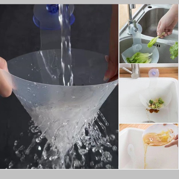 Phễu nhựa lọc rác cho bồn rửa chén - Phễu lọc rác thông minhPhễu là 1 tấm nhựa có đục lỗ kích thước 42x19cm. Sau đó được quấn lại và treo vào bồn rửa dùng để lọc rác chống nghẹt ống thoát nước thải. Sau khi sử dụng có thể mở ra rửa sạch và đem cất.