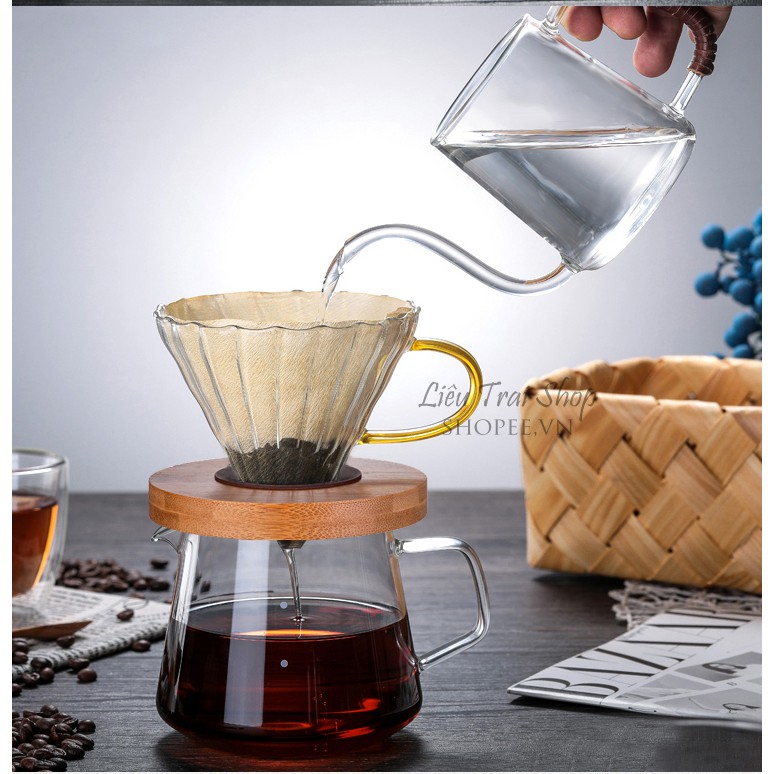 Phễu pha cà phê cafe giấy lọc V60 thuỷ tinh Pour over drip chemex giá gỗ kèm gioăng silicone