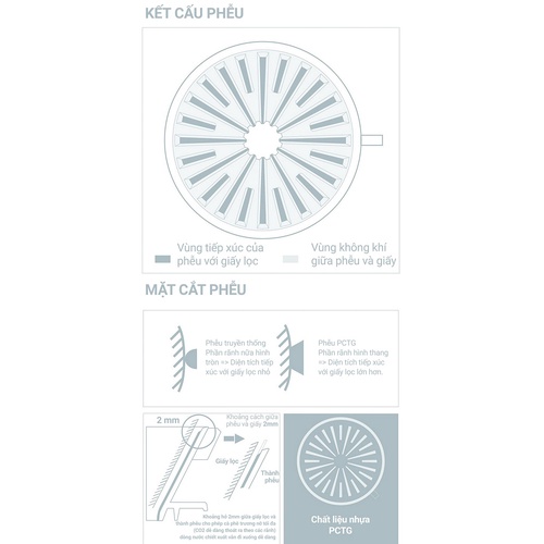 🔸Giống như phễu lọc khác, phễu được thiết kế dạng hình nón, góc lệch 60 độ kèm theo hệ đường gân trong lòng phễu.