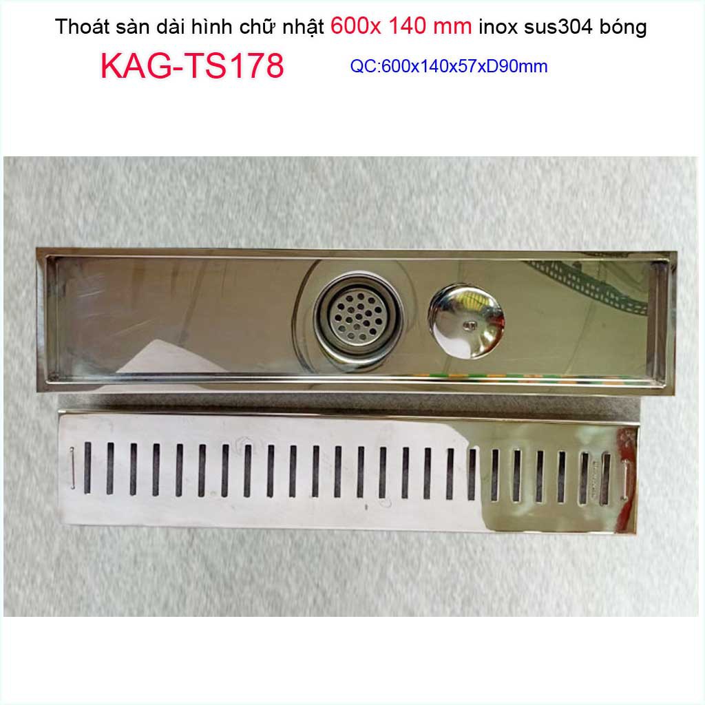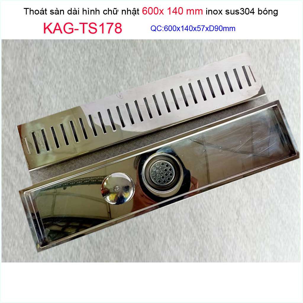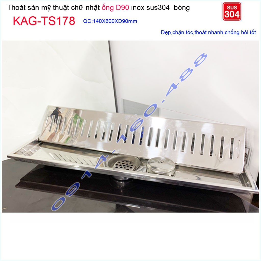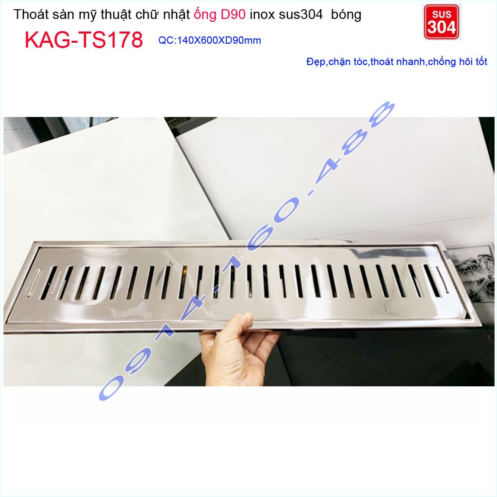 Phễu thoát sàn 14x60cm KAG-TS178(D90-114), thoát sàn nhà tắm hình chữ nhật SUS304 inox dập khuôn sáng bóng cao cấpKích thước 140mmx600mm ống D90-114