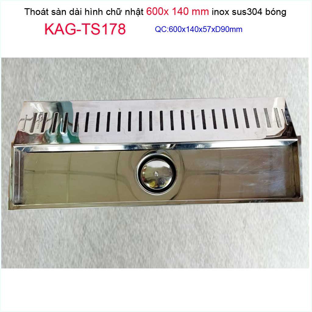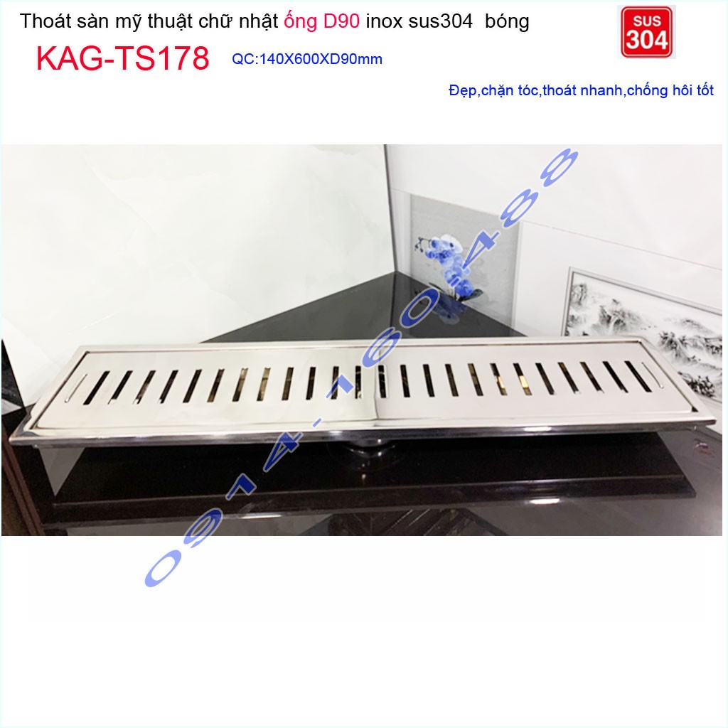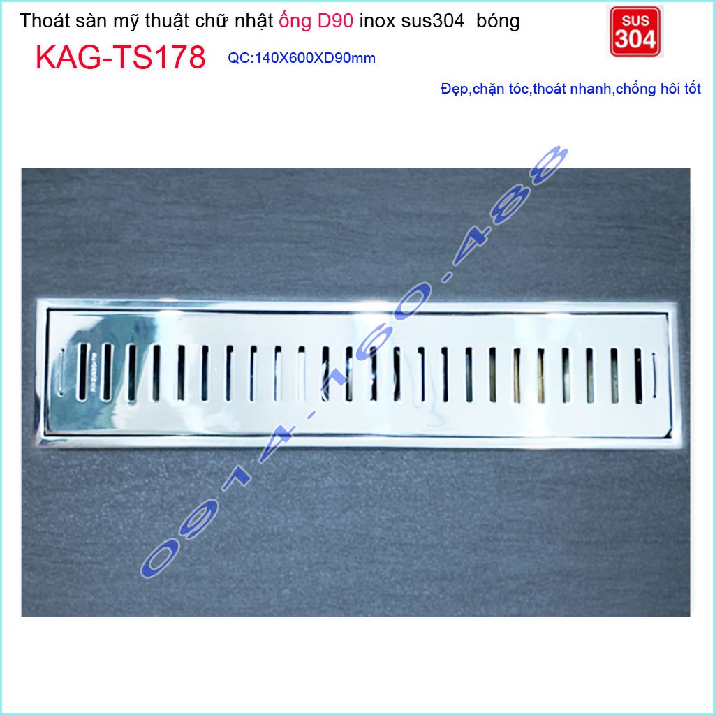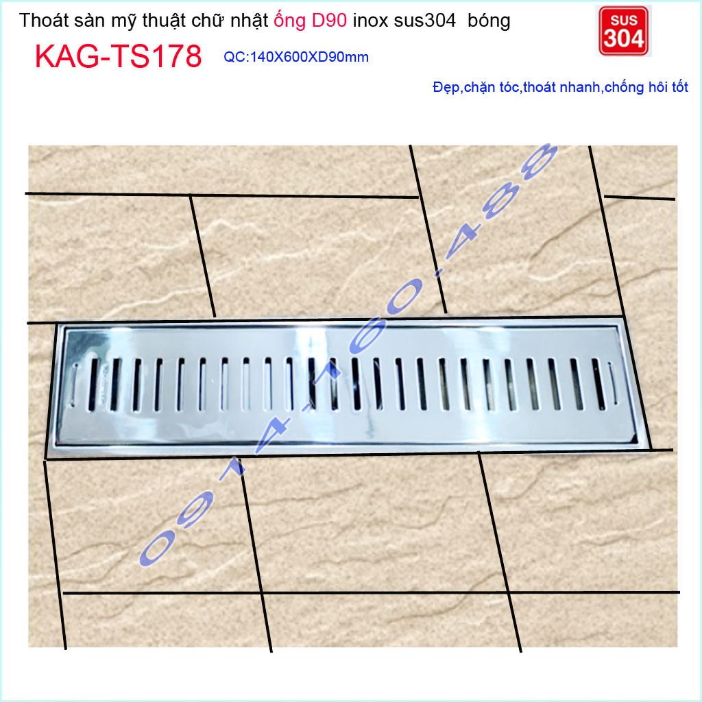 Phễu thoát sàn 14x60cm KAG-TS178(D90-114), thoát sàn nhà tắm hình chữ nhật SUS304 inox dập khuôn sáng bóng cao cấpKích thước 140mmx600mm ống D90-114