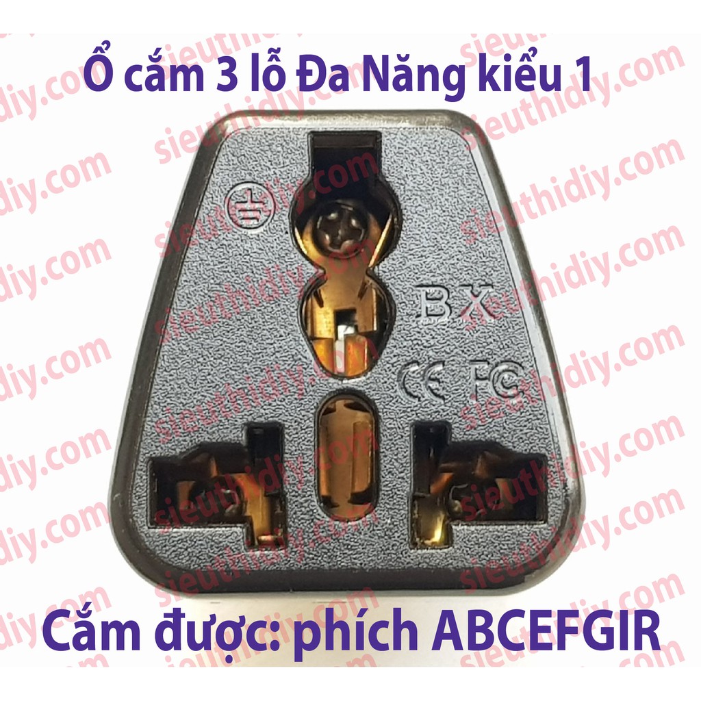 - Xem hình minh họa để biết mỗi loại Ổ Cắm Đa Năng hỗ trợ cắm được loại Phích cắm nào ( Phích cắm của thiết bị, máy móc mình muốn sử dụng ).