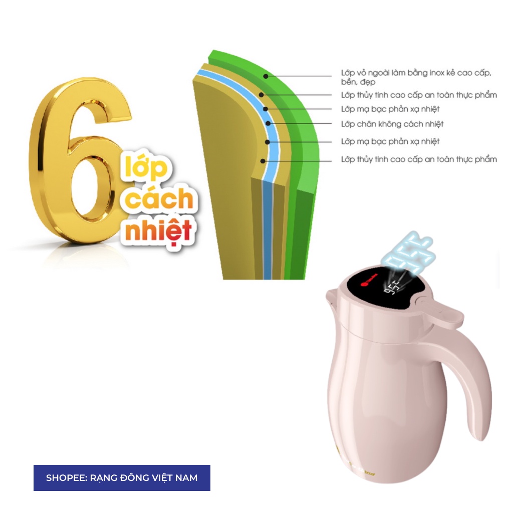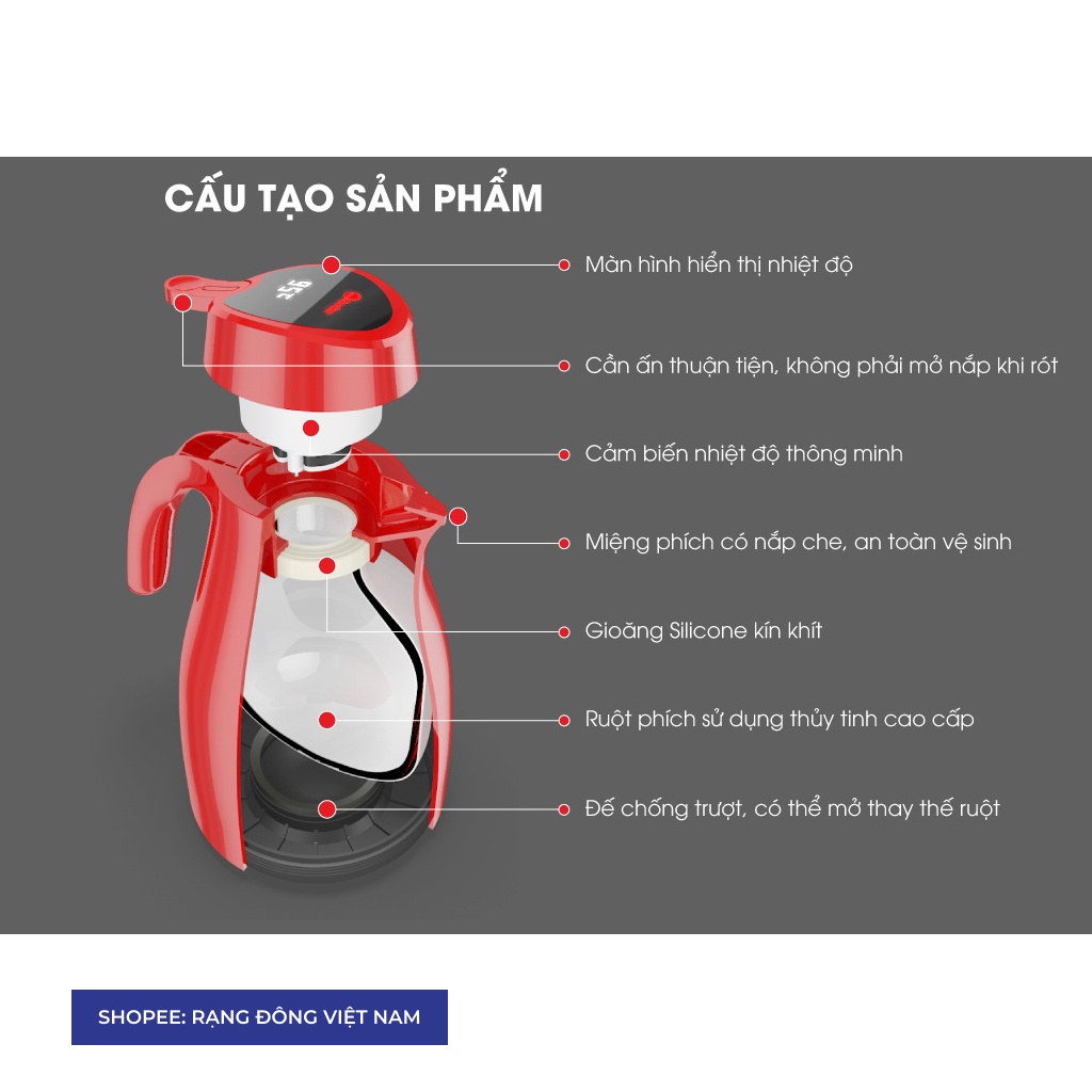 Phích nước Rạng đông 1,5 lit, Phích pha trà hiển thị nhiệt độ thông minh, Bình thuỷ giữ nhiệt RD-1542 N3.E