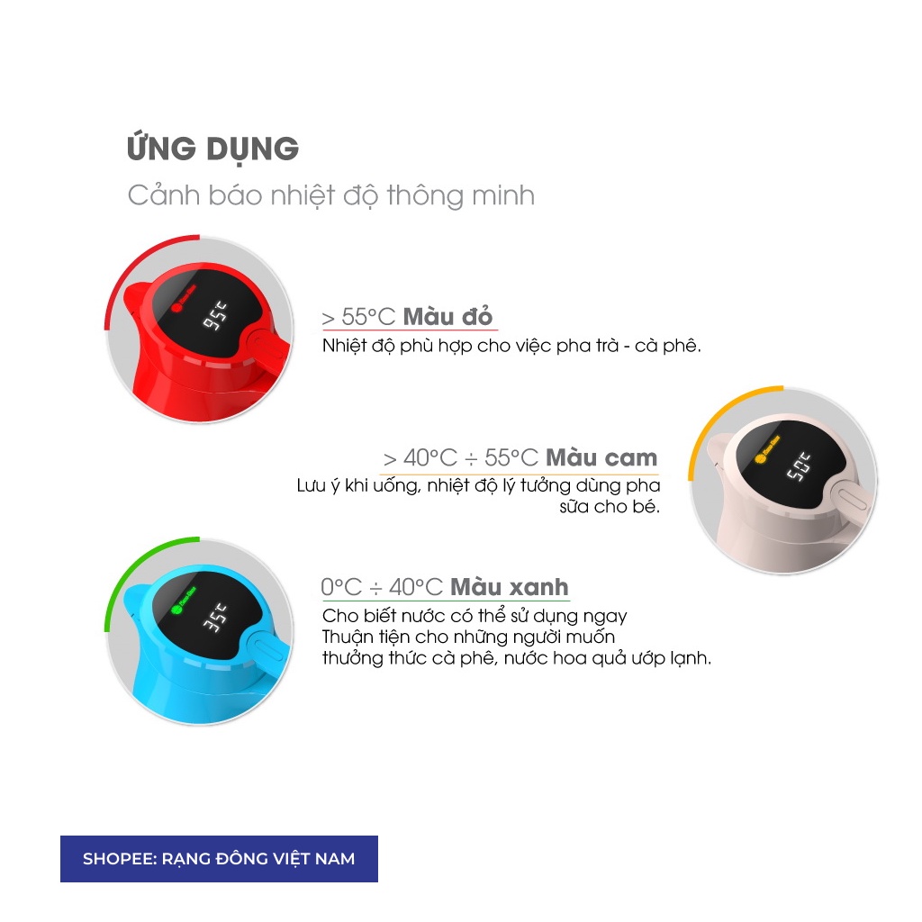 👉Nắp có hiển thị nhiệt độ & cảnh báo độ nóng của nước thông qua thay đổi 3 màu xanh, vàng, đỏ của logo, giúp người dùng dễ dàng kiểm soát nhiệt độ nước nóng, thuận tiện khi sử dụng.
