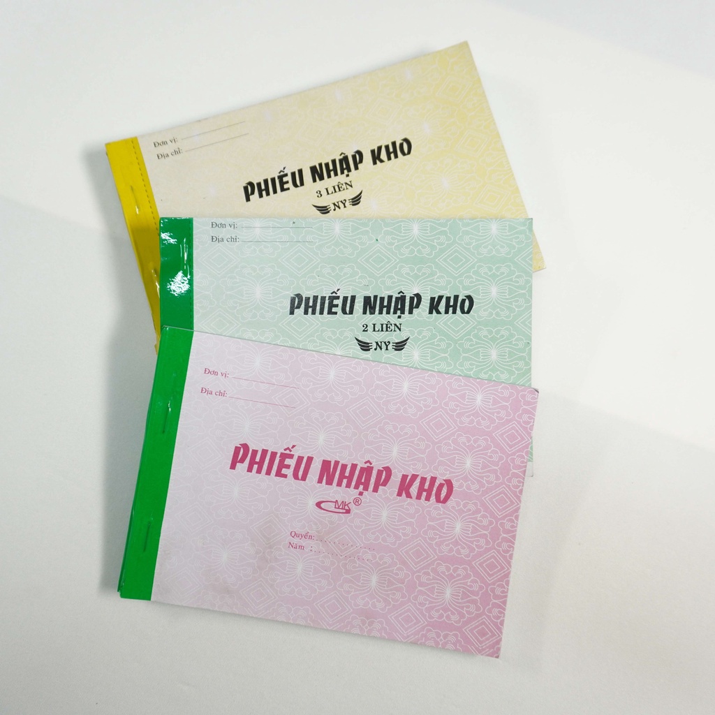 - Phiếu nhập kho 3 liên 13x19cm (50 bộ = 150 tờ): 3 liên trắng - hồng - xanh lá, khổ 13x19cm, 50 bộ = 150 tờ, 5 quyển/1 lốc