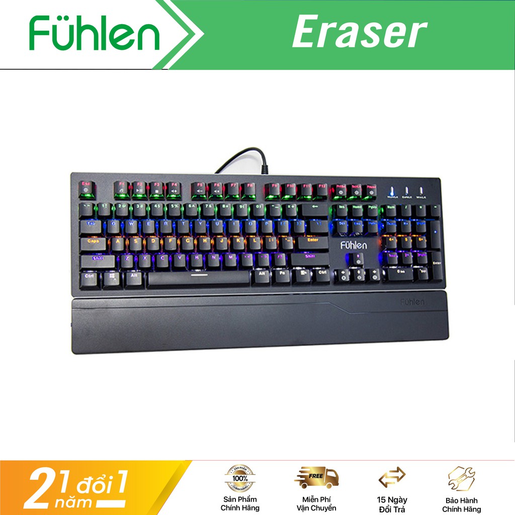 -Bàn phím quang cơ Fuhlen Eraser là bàn phím chơi game với phân khúc tầm trung với đầy đủ tính năng anti ghost, khóa phím, multi media, hiệu ứng led làm say mê người dùng công nghệ. Hãng Fuhlen còn không quên tặng kèm một chiếc kế tay nhựa, giúp tạo cảm giác thoải mái hơn trong quá trình sử dụng.