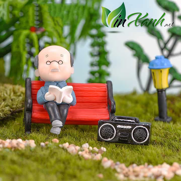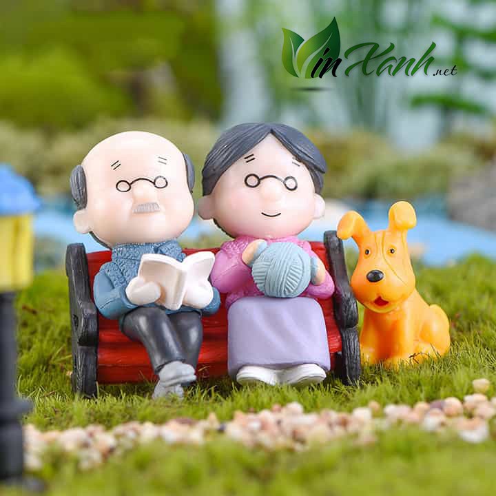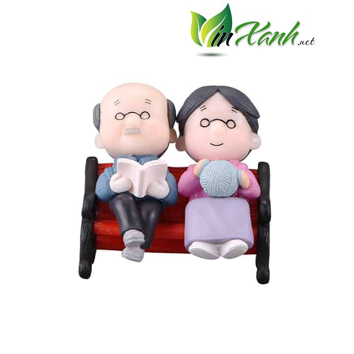 Phụ kiện cặp đôi mô hình ông bà lão ngồi ghế đỏ trang trí nhà cửa bàn học cây xanh.