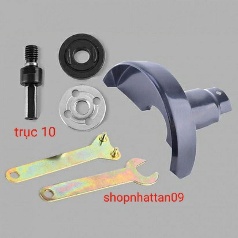 Bộ phụ kiện bao gồm: 2 Vòng siết để giữ đĩa cắt, 2 khóa để mở, 1 trục chuyển, 1 lá chắn bảo vệCÓ 2 LOẠI: Trục kẹp đầu khoan đường kính 10mm và 6mm