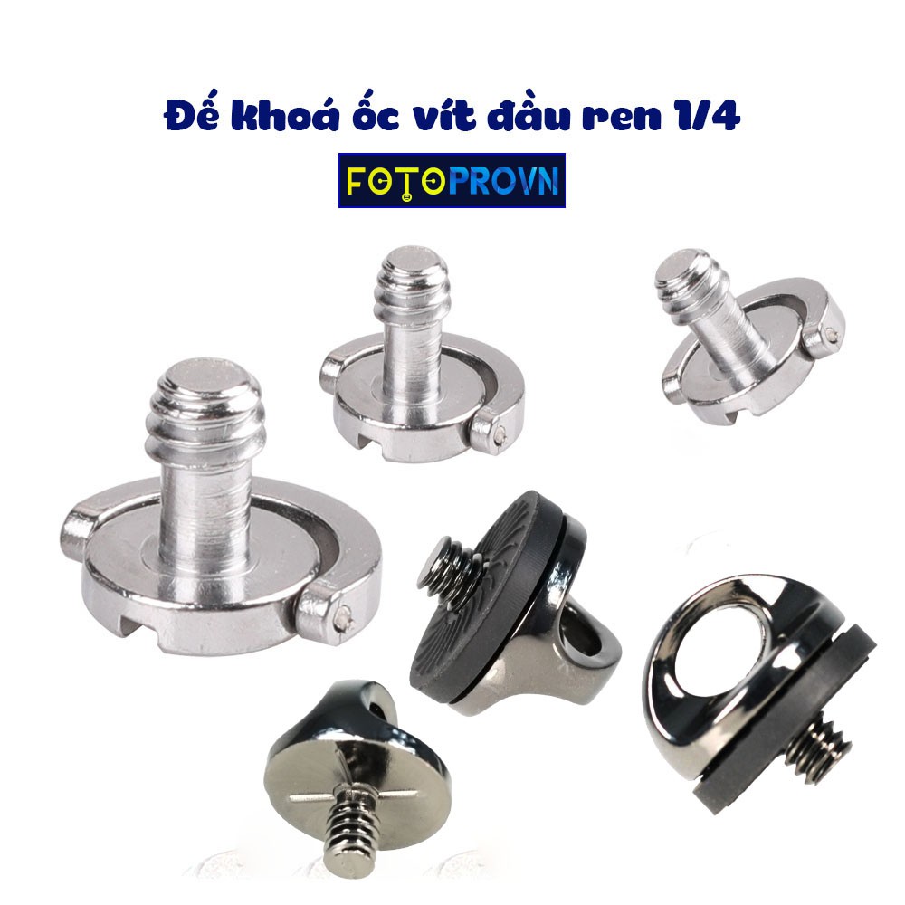 Đế khóa ốc vít có đầu ren chuẩn 1/4 dùng cố định vô thân máy ảnh, đế vít có lỗ để móc khóa dây đeo giúp bảo vệ an toàn cho máy ảnh.Đế được thiết kế bằng kim loại sắt mạ niken chống gỉ sét có độ bền cao.