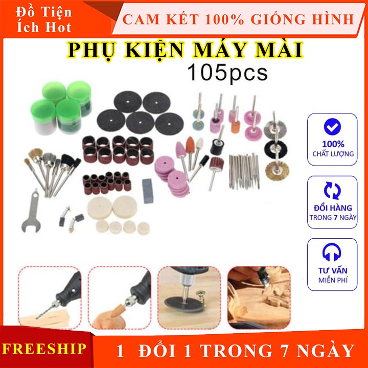 Nhà cửa & Đời sống > Dụng cụ & Thiết bị tiện ích > Dụng cụ > Cưa, máy cắt & máy mài || Bộ phụ kiện máy khoan điện mini 105 chiếc đa năng dùng quay, mài, đánh bóng gỗ, chất liệu nhựa + kim loại bền bỉCòn hàng