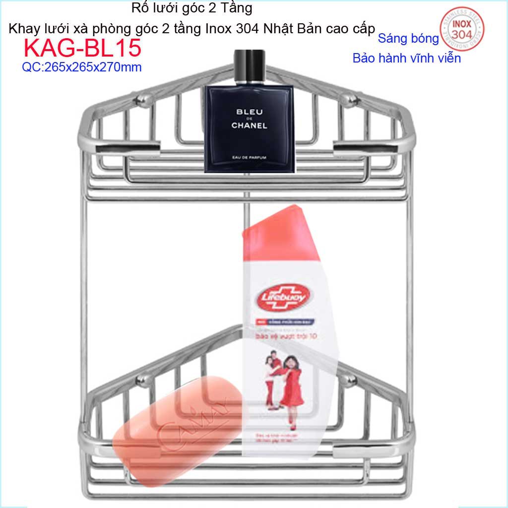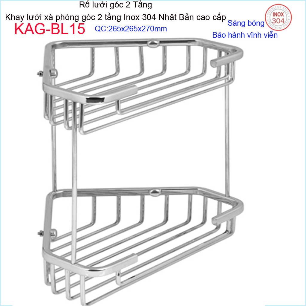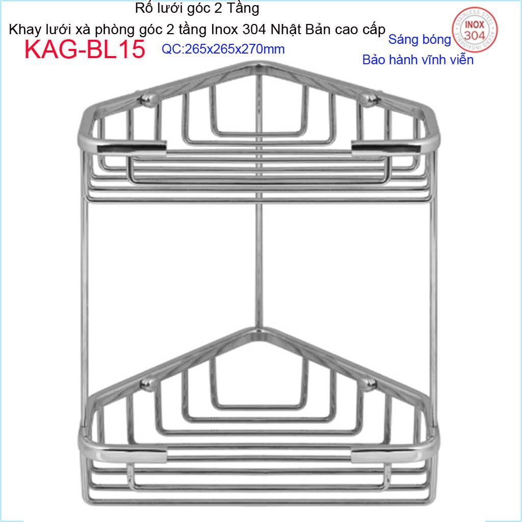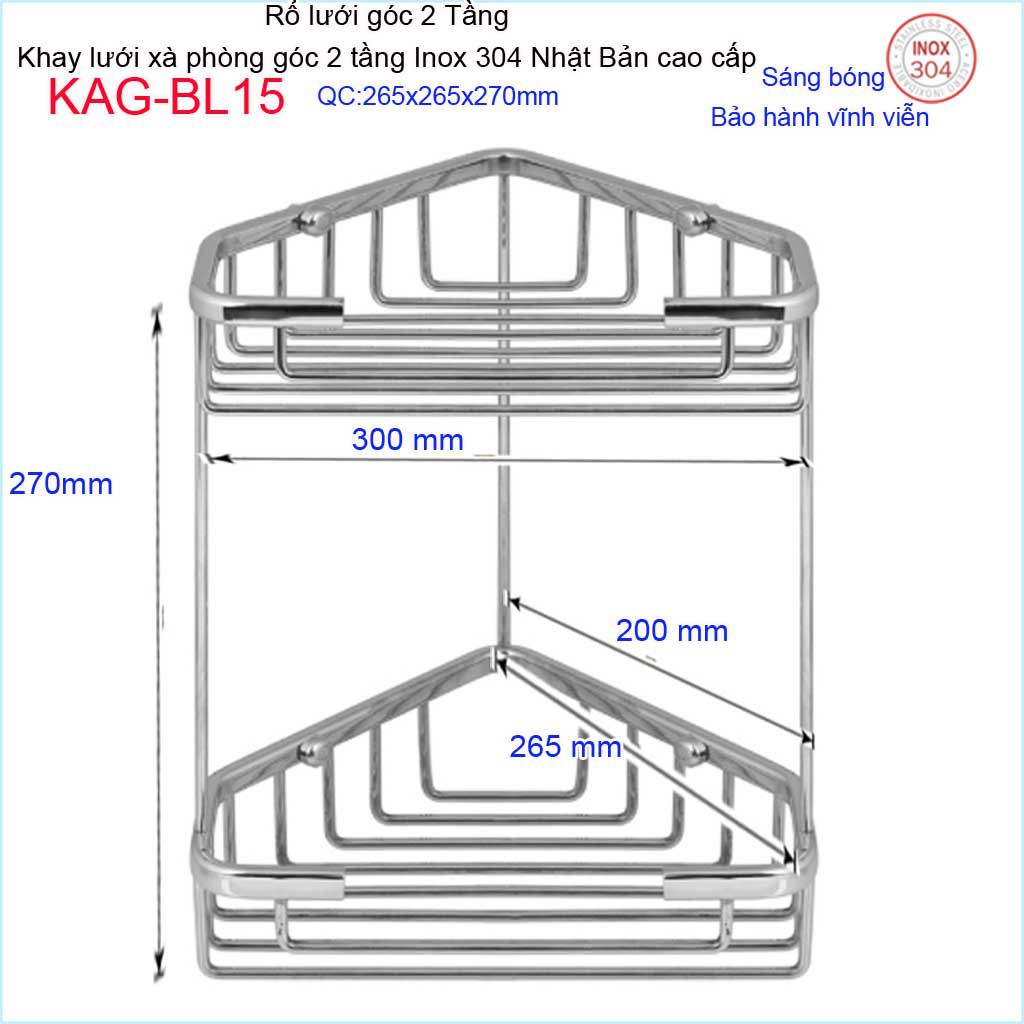 Kệ góc 2 tầng 265x265 mm KAG-BL15, kệ rổ xà phòng góc tam giác lớn SUS304 Nhật cao cấp inox đặc sáng bóng tuyệt đẹp
