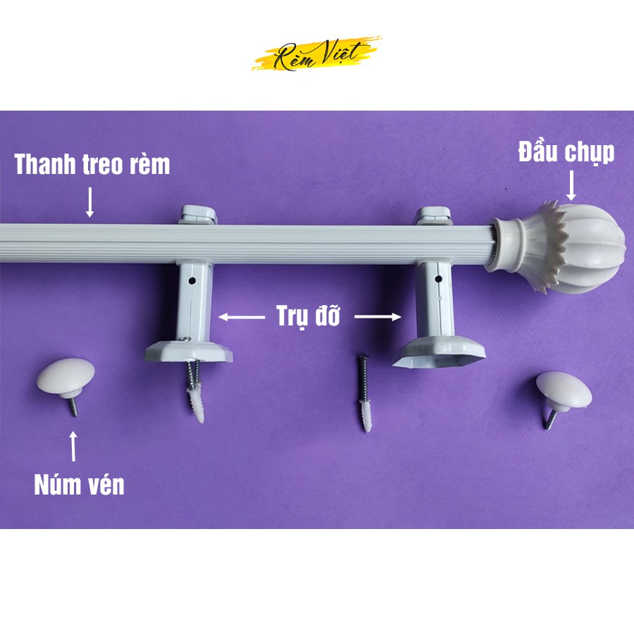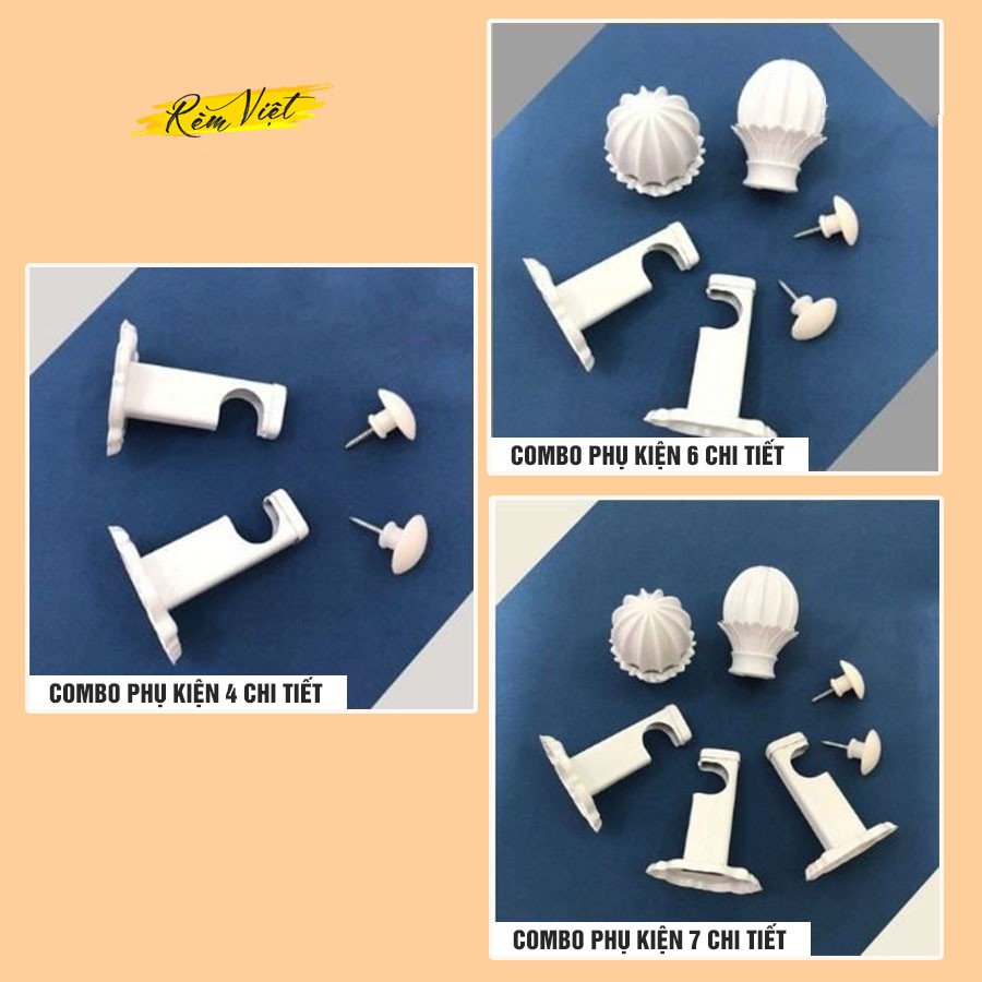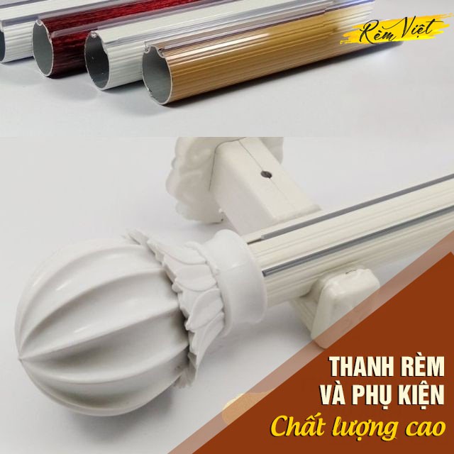 Phụ kiện rèm cửa đầy đủ bao gồm thanh treo rèm vải, núm vén rèm, trụ tường, đầu bịt trang trí thanh