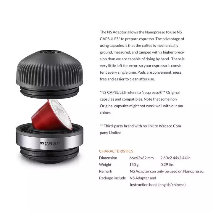 Phụ Kiện Thay thế sử dụng cà phê dạng Nén Wacaco Nanopresso NS AdapterBộ điều hợp NS cho phép Nanopresso sử dụng CAPSULES. Ưu điểm của việc sử dụng viên nang là cà phê được xay cho kích thước espresso, cân và đóng gói, với độ chính xác cao. Có rất ít chỗ cho sai sót. Chất lượng chiết xuất không đổi. Các viên nang là thiết thực và dễ vận chuyển. Sau khi sử dụng máy được làm sạch chỉ trong vài giây.