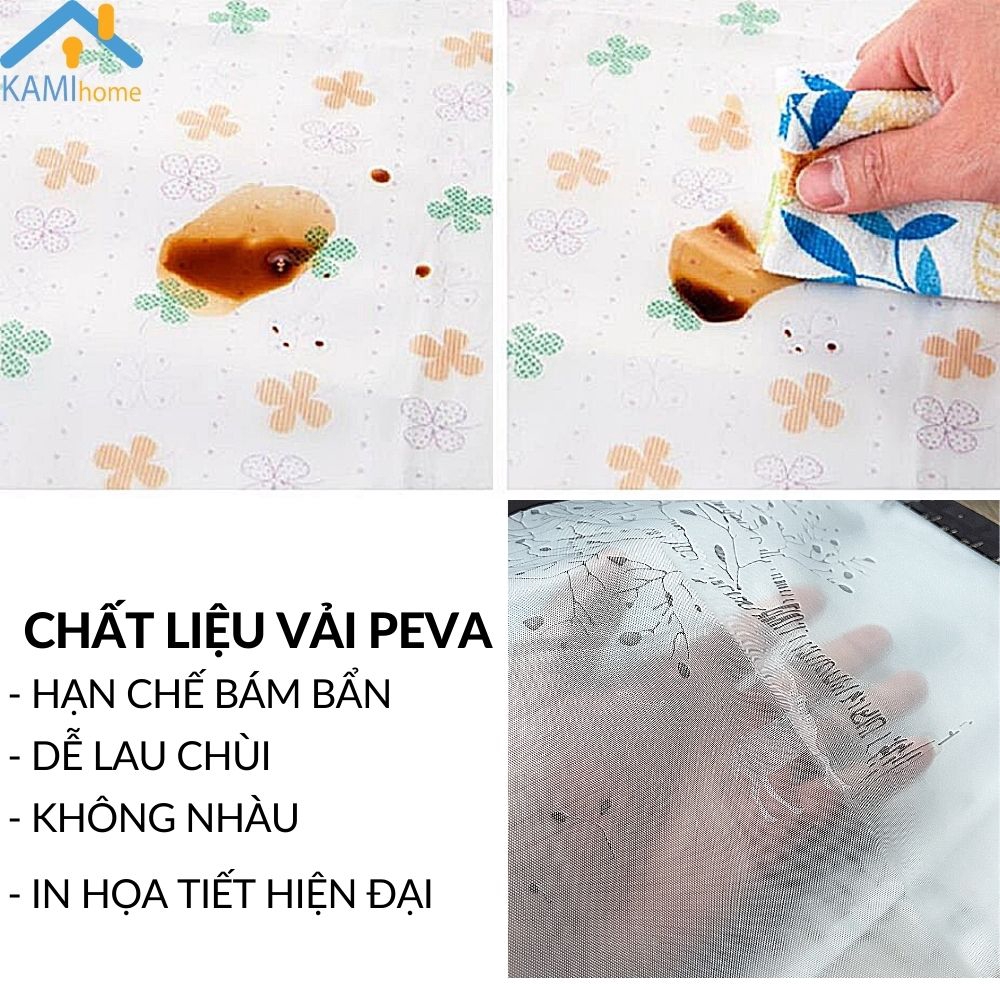 - Chất liệu Vải PEVA (Rèm cửa hay dùng): không nhàu, không thấm nước, ít bám bụi, dễ lau chùi vết bẩn...