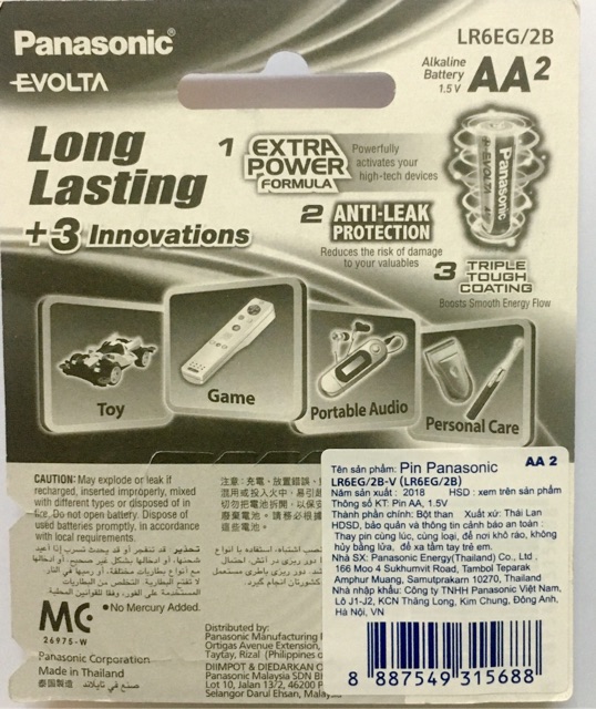 Sản phẩm pin Evolta thế hệ 6 của Panasonic là loại pin tốt nhất trên thị trường hiện nay. Cho thời gian sử dụng cực lâu.Xuất xứ : Thái Lan