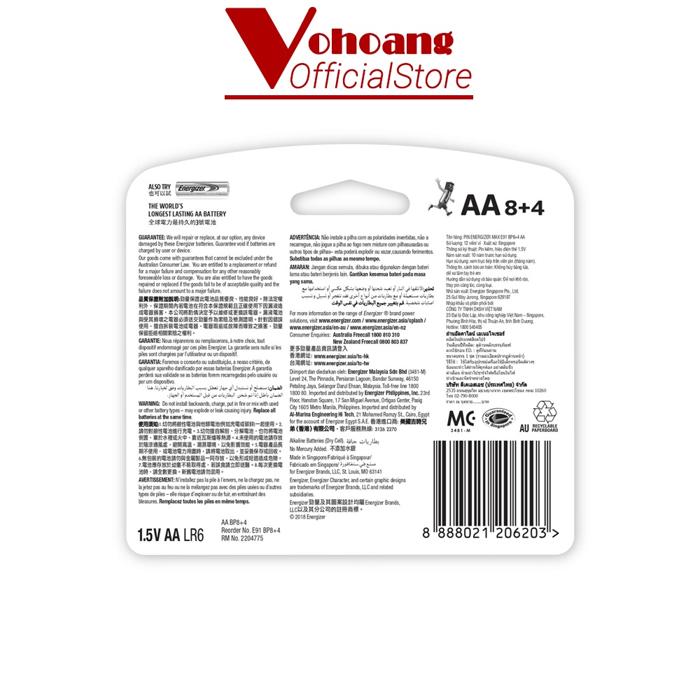 Thiết Bị Điện Gia Dụng > Pin || Pin AA Energizer Alkaline chống chảy E91 - 8 pin tặng kèm 4 pin freeCòn hàng