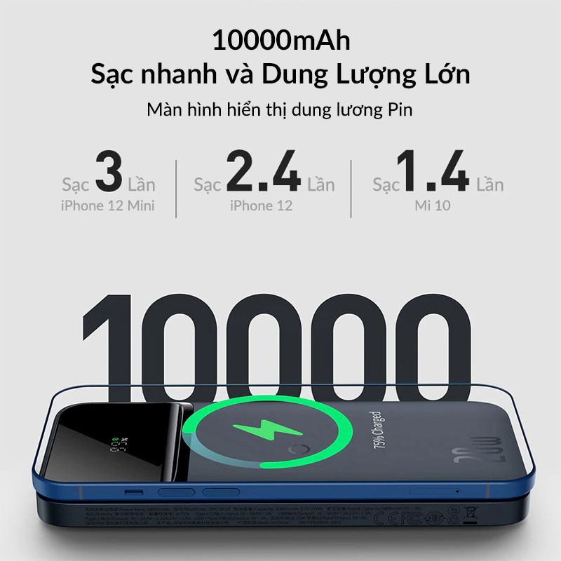 🔷 10000mAh Sạc Nhanh và Công Suất Lớn, Sạc đầy 3 lần cho iphone 12 Mini, 2,4 lần cho iPhone 12, 1 lần cho Mi 10