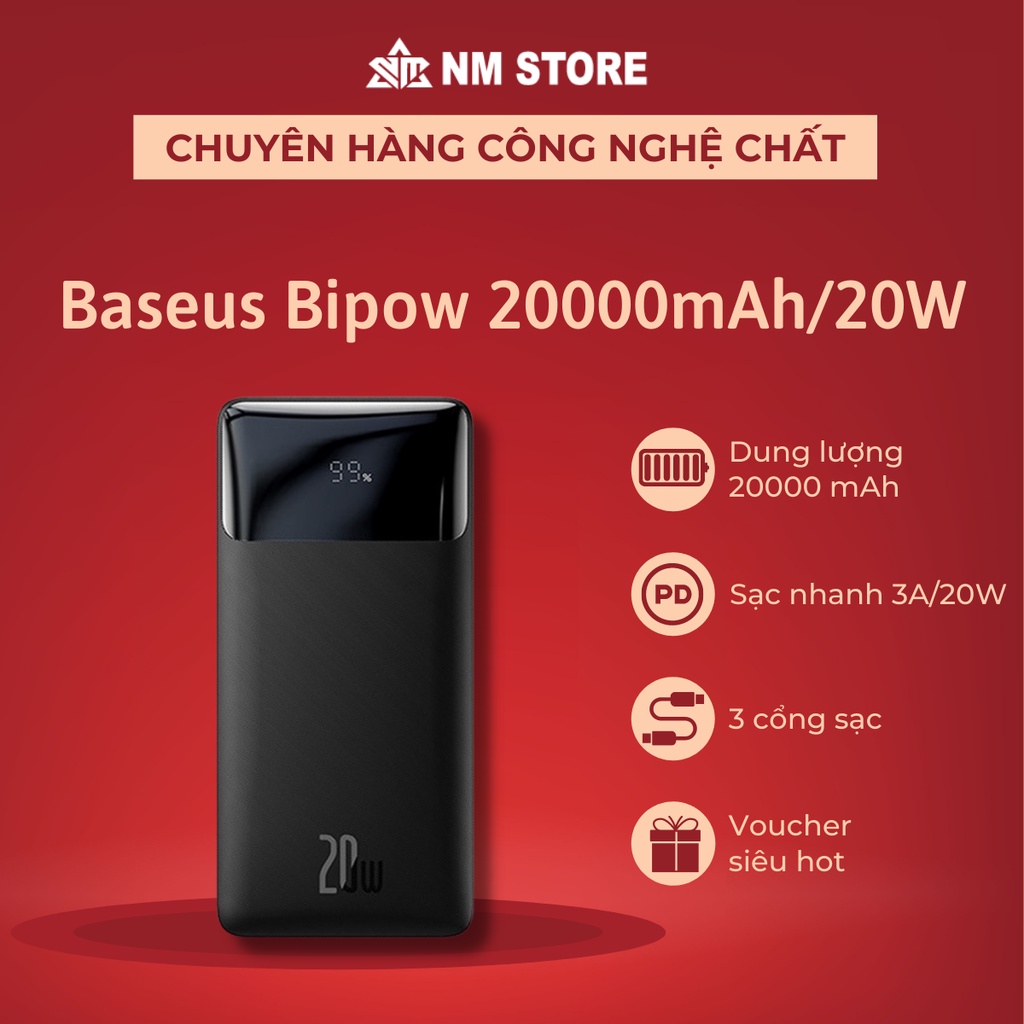 Pin dự phòng PD 20W Baseus Bipow Digital Display sạc nhanh 3A, dung lượng 20000mAh, có đèn LED hiện thị, 3 cổng OutputThương hiệu: Baseus